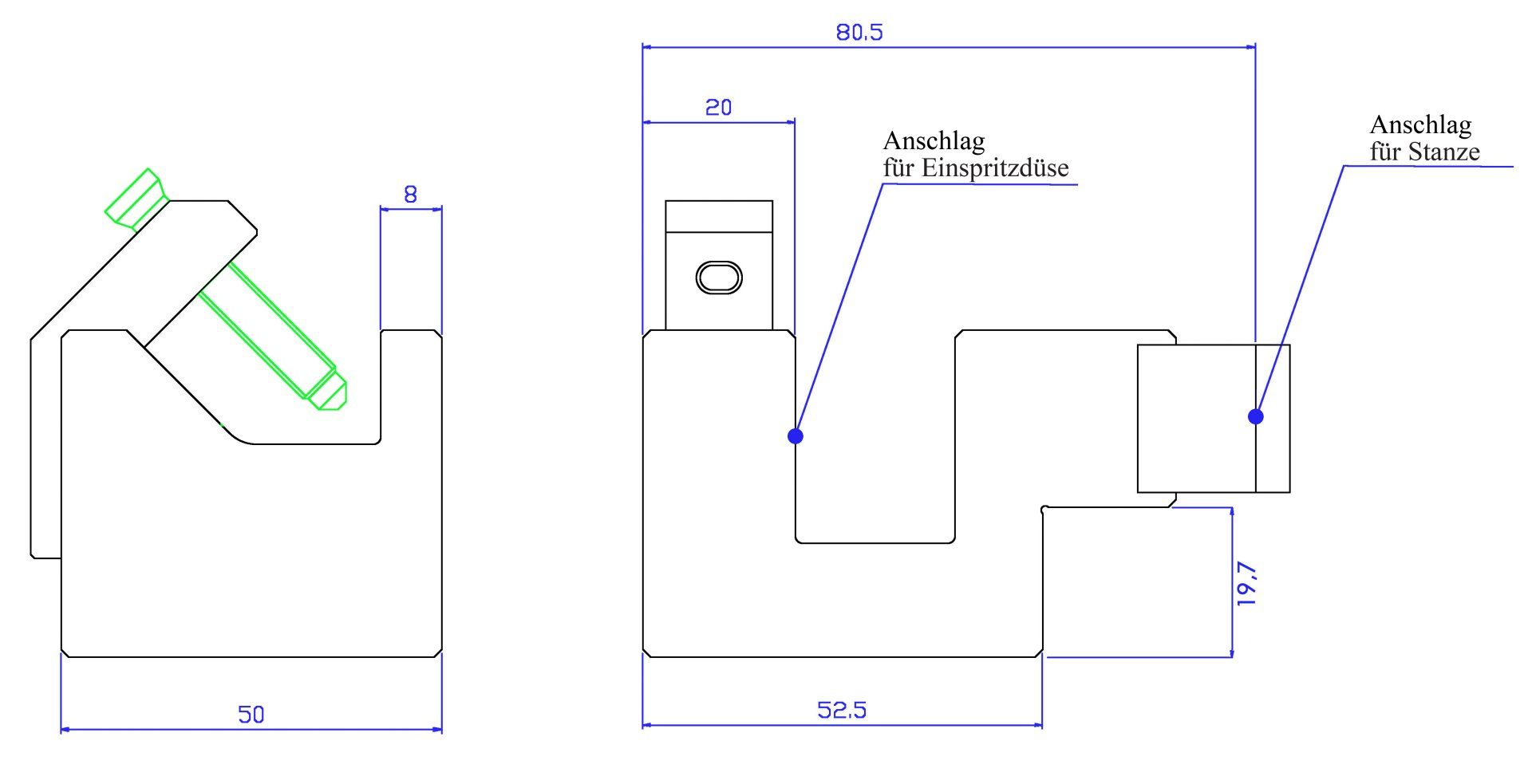 Die Einspritzdüsen werden bündig mit einem Abstand von 20 mm von der messbaren Aussenseite des Spannkörpers positioniert, während die Stanzen mit einem Abstand von 80,5 mm von der messbaren Aussenseite der verschiebbaren Schelle positioniert werden.