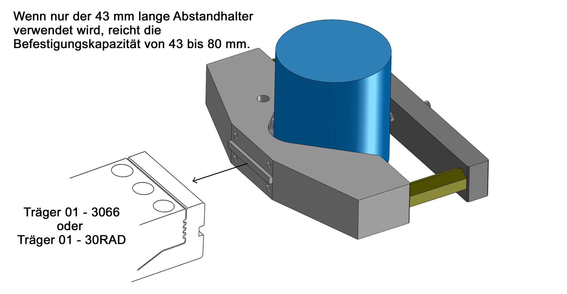 Wenn nur der 43 mm lange Abstandhalter verwendet wird, reicht die Befestigungskapazität von 43 bis 80 mm.