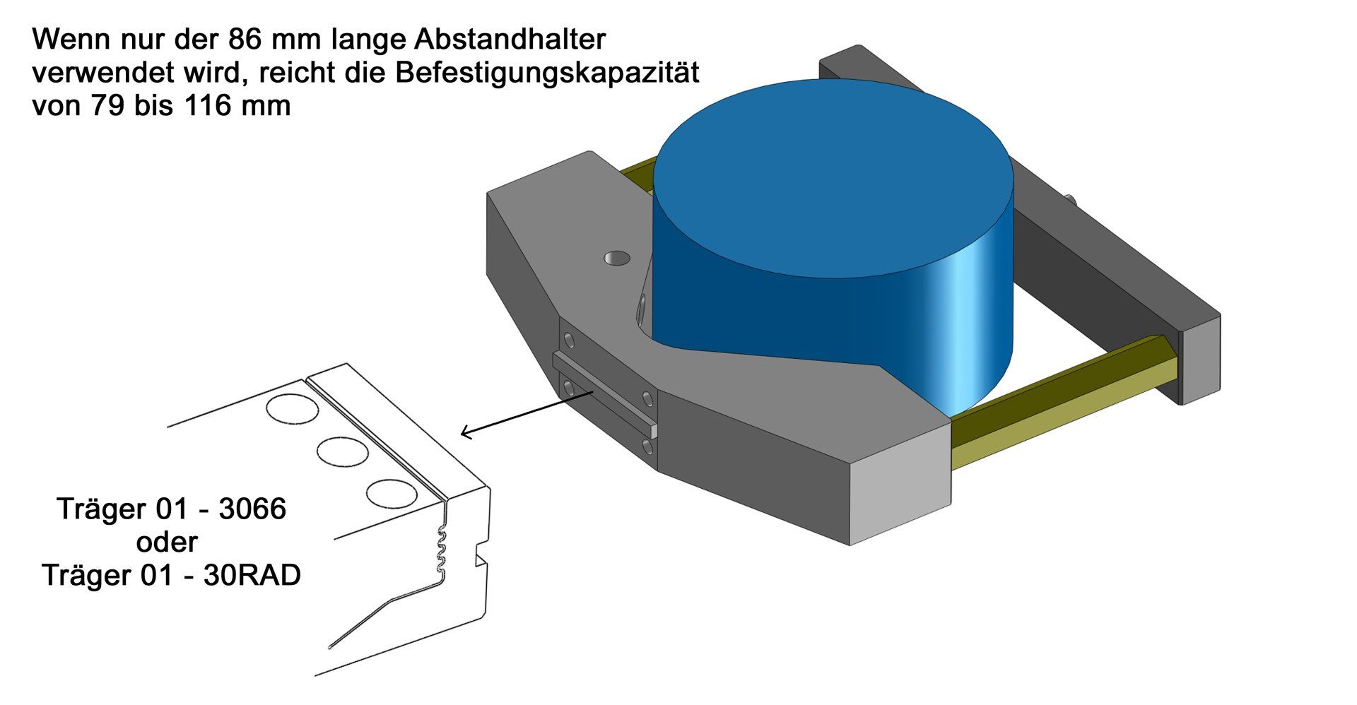 Wenn nur der 86 mm lange Abstandhalter verwendet wird, reicht die Befestigungskapazität von 79 bis 116 mm.