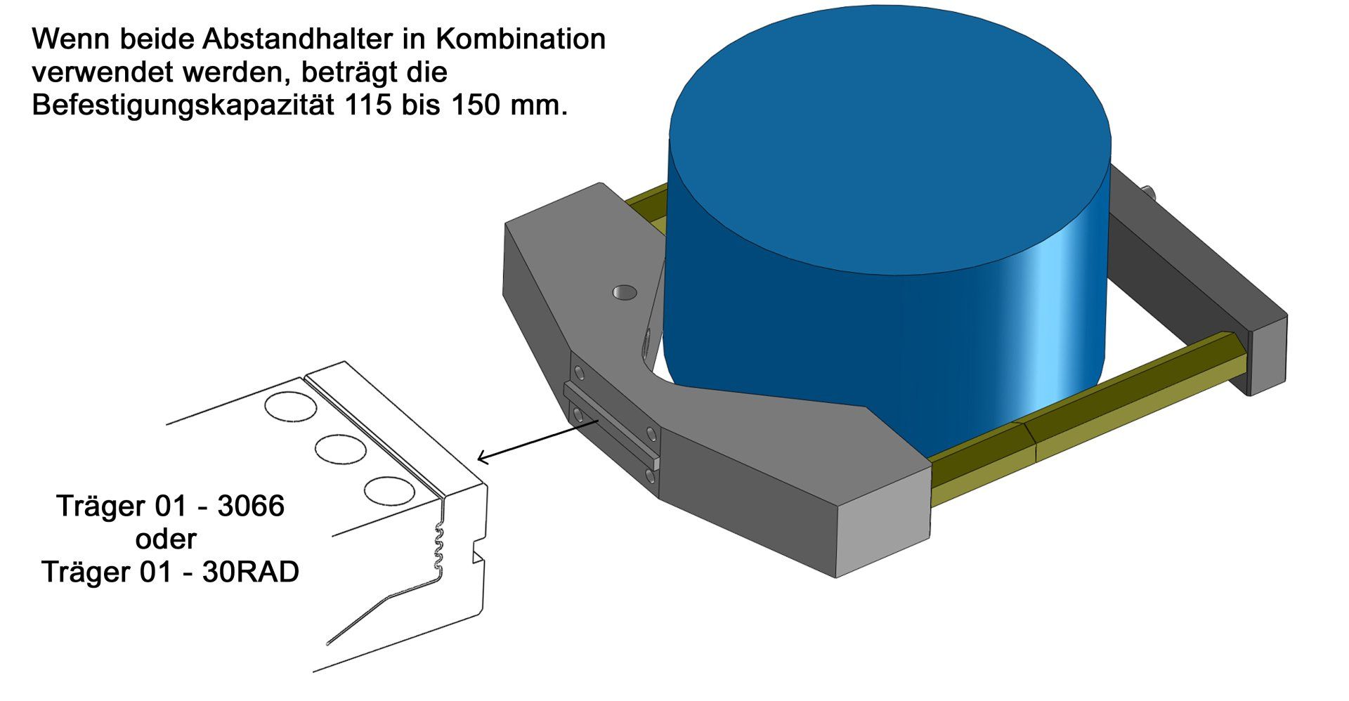 Wenn beide Abstandhalter in Kombination verwendet werden, beträgt die Befestigungskapazität 115 bis 150 mm.