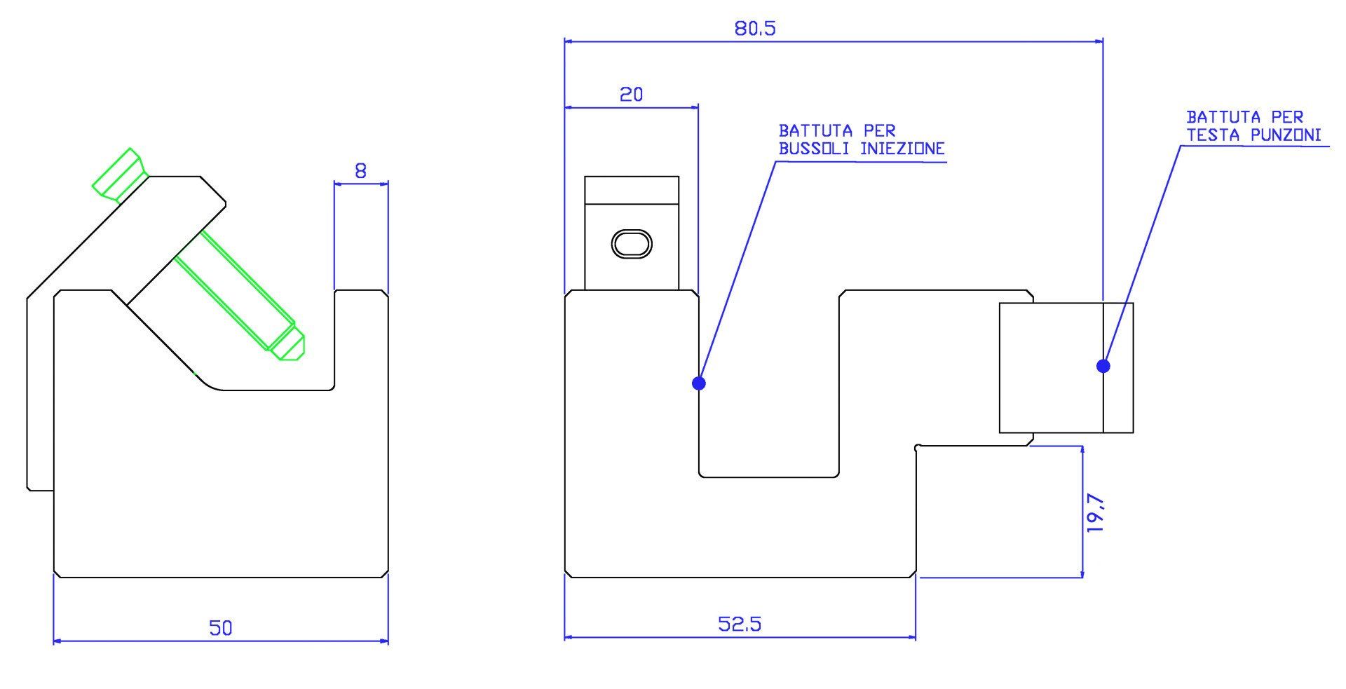 Le bussole per iniezione vanno posizionate a battuta sulla superficie a 20 mm dalla faccia misurabile della morsetta, mentre i punzoni vanno posizionati a battuta sulla superficie dello scontro scorrevole a 80,5 mm dalla faccia misurabile. Per un perfetto risultato la quota 80,5 deve essere verificata in quanto deriva da una lavorazione di serie.